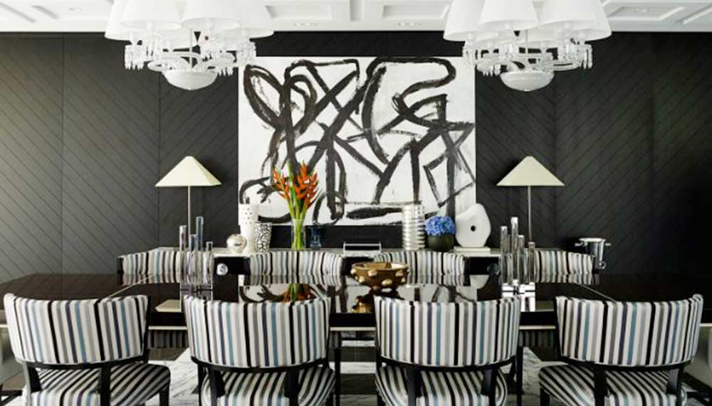 Natale’s mastery of proportion is on display throughout the home’s spacious interior. In the dining area, a long table custom-made from Macassar ebony by the New York furniture designer Dakota Jackson sits amid generous chairs from Bolier. Natale set the patterns at play, making this space one of the home’s most layered: The square motif of the custom plaster ceiling panels echoes the graphic marble floor, while Hermès striped fabric on the chairs contrasts with the chevron-panelled walls of black-stained American oak. The area’s crown jewels, two Baccarat crystal chandeliers, counterbalance a wildly expressive Dick Watkins painting. “I do love adding abstract work, because I really think they add some energy,” says Natale.