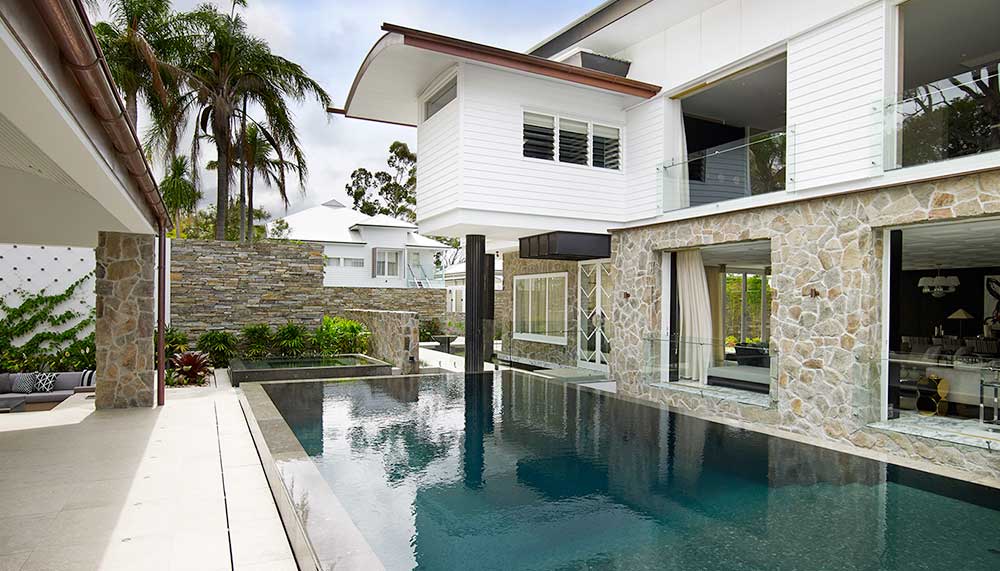 The owners of a traditional Queenslander in Brisbane, Australia, approached Sydney’s Greg Natale not only to remodel that house but to design the interiors of a newly built modern home on their estate. The couple wanted his signature style, an aesthetic maybe best described as part David Hicks bold graphics, part Kelly Wearstler luxe glam, all pulled together with a certain modern elegance. Natale – an interior designer known for wearing slim navy suits and crisp white shirts that evoke a fashionable Tom Ford–like aura – understood their vision for the property and how to achieve it.