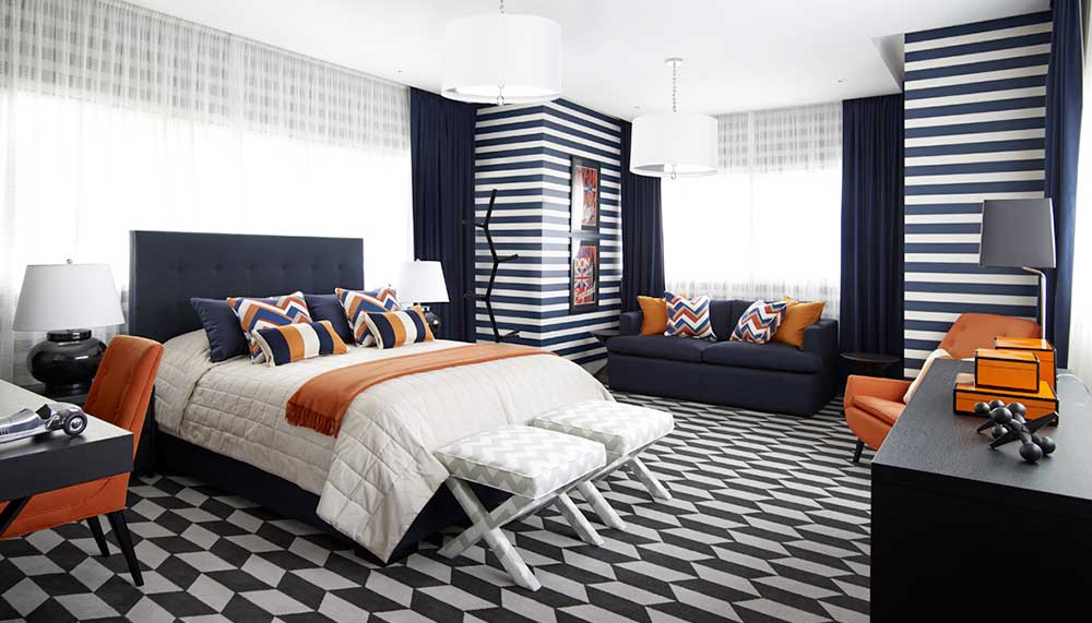 Back inside, on the home’s top level, the master bedroom maintains Natale’s focus on pattern. Navy elements are also significant here, serving as sophisticated additions to the largely black-and-white colour scheme seen throughout the house. On a buying trip to Los Angeles, Natale says, “we kept going from store to store and the owner kept buying navy for himself, his wife, and daughter. I said, ‘You really love navy, don’t you?’ ”
