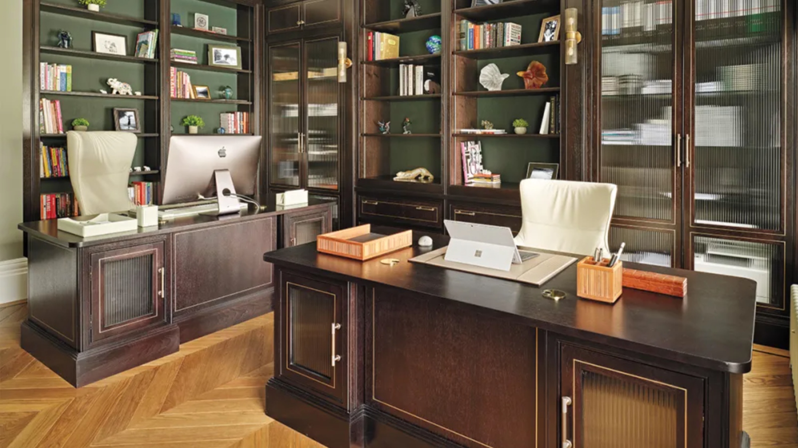 “One hundred percent of our clients want [integrated] tech,” says London-based designer Katharine Pooley, who has designed castles, superyachts, and jets for royalty around the world. “They’re used to it, and they want it done better.” This means seamlessly integrating the technology in such a way that “none of our desks have computers or wires on them anymore—everything’s wireless, everything’s seamless.” A bespoke Pooley design allows for computers to be concealed within the casework, to be raised and lowered at the push of a button; these statement desks are made by hand and can take up to eight months, with prices running into the high five figures or more.