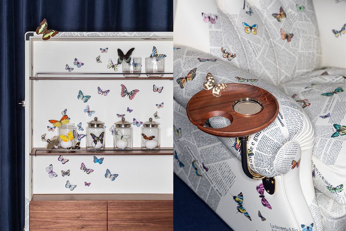 This time around, the two brands revisit the archives to bring new life to two re-editions: the 1919 armchair and the Isidoro trunk-bar. The armchair holds a special place in Poltrona Frau history, as it was originally crafted by the brand’s founder, Renzo Frau. It was designed with a historic bergère silhouette and upholstered in lavish capitonné leather. Meanwhile, the Isidoro trunk-bar by Jean-Marie Massaud was brought to life in 2007, but its design channels the nostalgic glamour of the roaring ’20s. In this collaboration with Fornasetti, the two pieces donned a new look cloaked in Poltrona Frau’s Pelle Frau Colorsphere Impact Less leather, printed with the Ultime Notizie, an ethereal Fornasetti pattern created in 1950 by Fornasetti’s founder, Piero Fornasetti. The kaleidoscope of butterflies layered over vintage news clippings creates a fun trompe-l’oeil that gives the leather an almost paper-like texture.