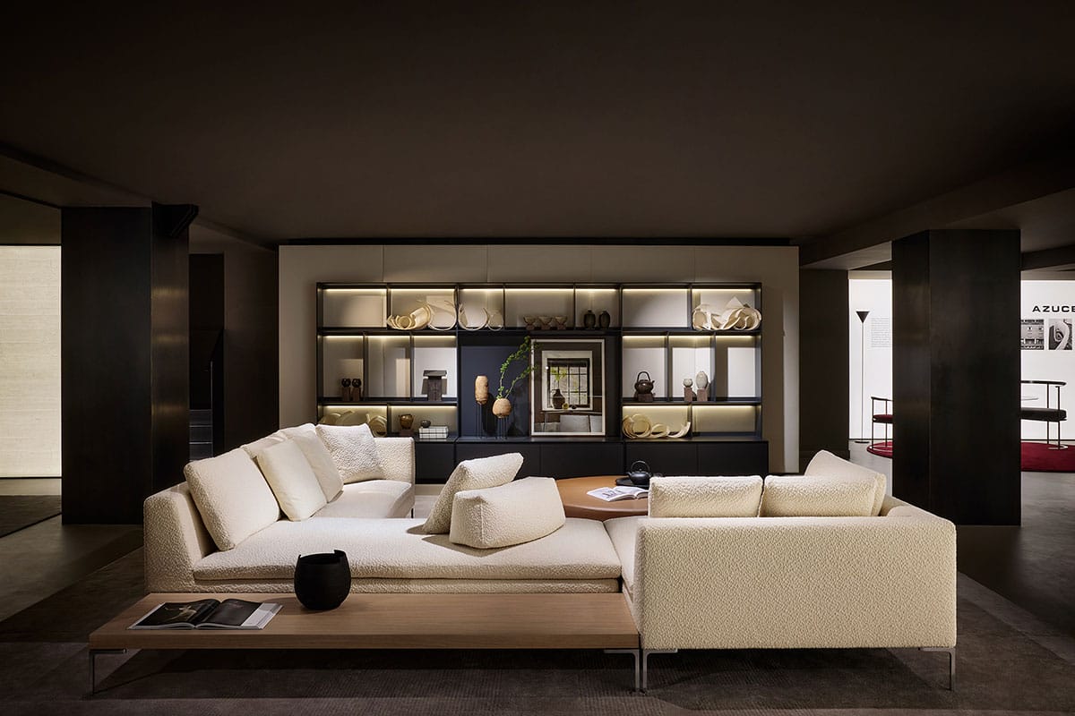 The Collection Amplified merges architectural rigour with refined materiality in a curated ensemble of indoor and outdoor settings. Among B&B Italia’s latest offerings are Cocùn by Antonio Citterio, a modular seating system with fluid, enveloping forms; Metropolitan Relax by Jeffrey Bernett, an ergonomically engineered lounge chair equipped with rocking and swivelling mechanisms; and Flat.C Frame by Citterio, a load-bearing living storage unit designed to function independently of wall support. These novelties appear alongside updated editions of Tufty-Time by Patricia Urquiola, Charles by Citterio, and Diesis by Citterio and Paolo Nava.