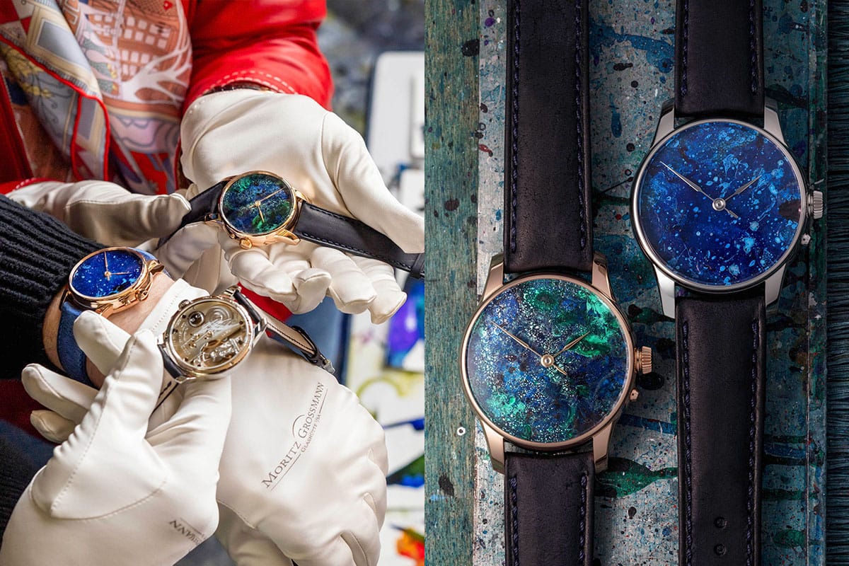 The Art Edition Max Frintrop by Moritz Grossmann is a dynamic confluence of horology and contemporary art, comprising 16 one-of-a-kind timepieces created in partnership with Düsseldorf-based abstract painter Max Frintrop. Each dial is crafted from a thin slice of Frintrop’s studio floor—an accidental canvas layered with years of spontaneous paint splatters. These 0.1 to 0.5mm fragments are preserved in their raw, textural form, transforming each piece into a wearable abstract artwork. Housed in either 18k rose gold or polished stainless-steel cases, they are powered by the finely finished, manual-winding calibre 100.1. Subtle yet refined, each piece is paired with a hand-stitched kudu leather strap, a sapphire crystal caseback engraved with Frintrop’s signature, and a clean dial free of hour markers to preserve the integrity of the artistic surface.