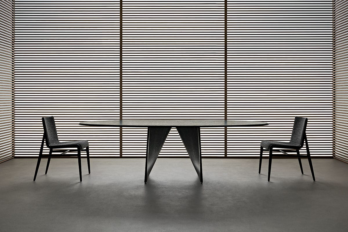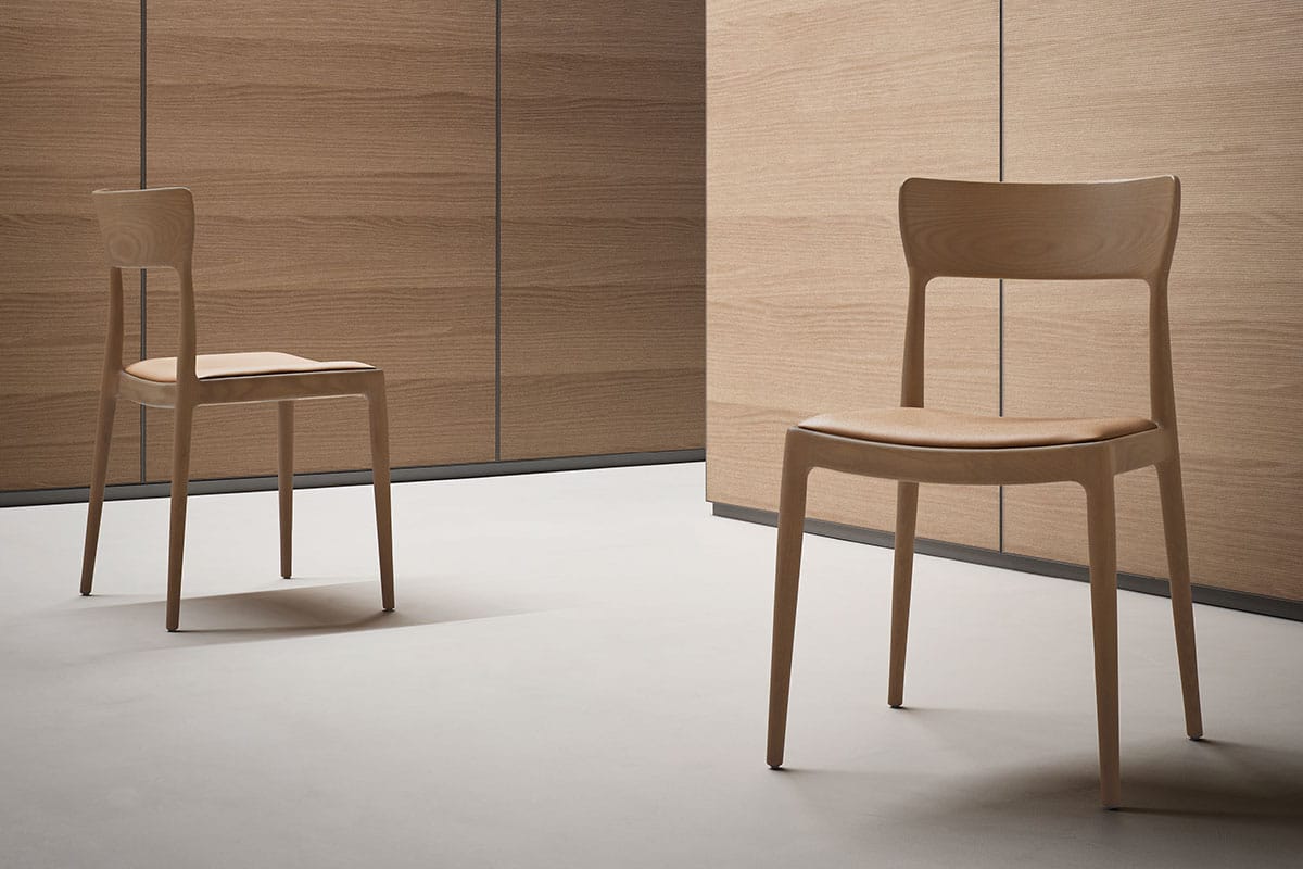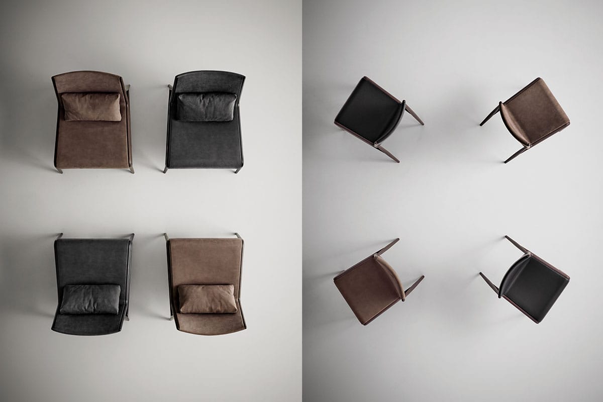 Giuseppe Bavuso, the architect and designer behind many of Rimadesio’s collections, is known for his rigorous minimalism and emphasis on technical experimentation. His latest range of furnishing elements shares a strong, stylistic identity that reflects the brand’s philosophy of cohesive design. From hand-sanded wooden frames to stitched leather trims and tabletops finished with the new Terrae treatment, the collection is built upon a continuous exploration of textures, surfaces, and colour schemes. This brings together the Lambda table with sleek, fluid lines; the wooden-framed Sinua chair and armchair; the Wabi chair with delicate rope and leather details; the Sophis chair with its wide, embracing backrest; and the Nest swivel armchair with soft contours and comfortable upholstery.