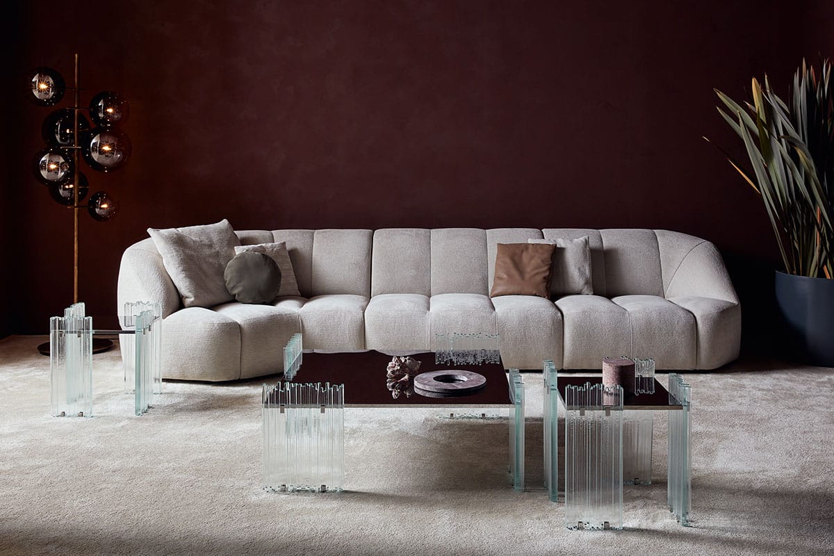 Central to Giorgetti’s new collection is the Giorgetti Maserati Edition, an Italian-made collaboration that equally adopts form and utility. This series introduces several conceptual keystones, including the Lorelai armchair, whose figurative silhouette recalls the dynamic curves of Maserati interiors, and the Teti pouf, a versatile piece offered as either an upholstered ottoman or a glass-topped storage unit that subtly references Maserati’s exhaust forms. Additional featured pieces include the Seidon modular sofa system, Ligea armchair, Ploto and Sibilia tables, and the richly textured Nemeris rug—each named after mythological sea figures. This mytho-industrial aesthetic extends outdoors with the Moorea collection by Carlo Colombo, while new additions such as the Tiber and Tiberina tables by Virginia Harper and the Floria table by Pierre-Yves Rochon expanded Giorgetti’s material vocabulary with stone, leather, and wood.