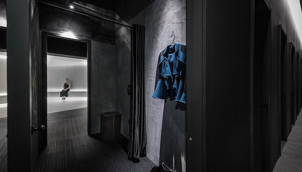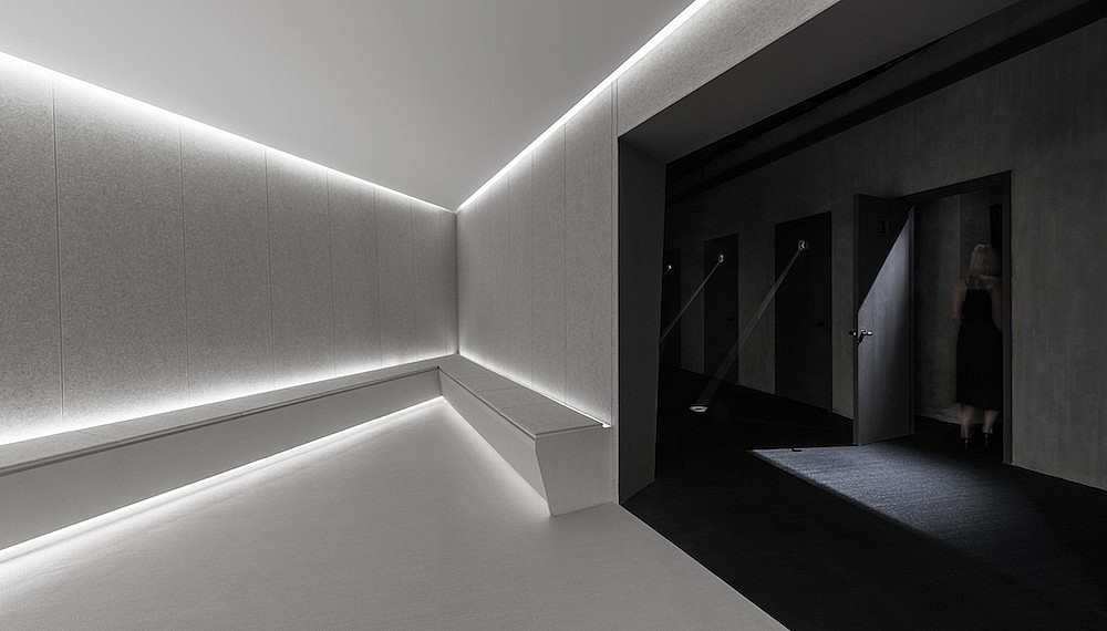 In the entry, audience members feel the instant impact of a dark, foreboding passage guided by thin streams of light. Even arriving at the theatre requires some work, as visitors enter from a furniture emporium off a side-street in central Shanghai. The curved cut of a corridor appears to narrow the space, and alters the journey of audience members. One of the firm noir elements the architects borrowed was a sense of distortion — this particular area does so effectively. For a clever light show in a small changing area, MDO deployed a film technique, projecting numbers from a pinhole aperture onto the floor.