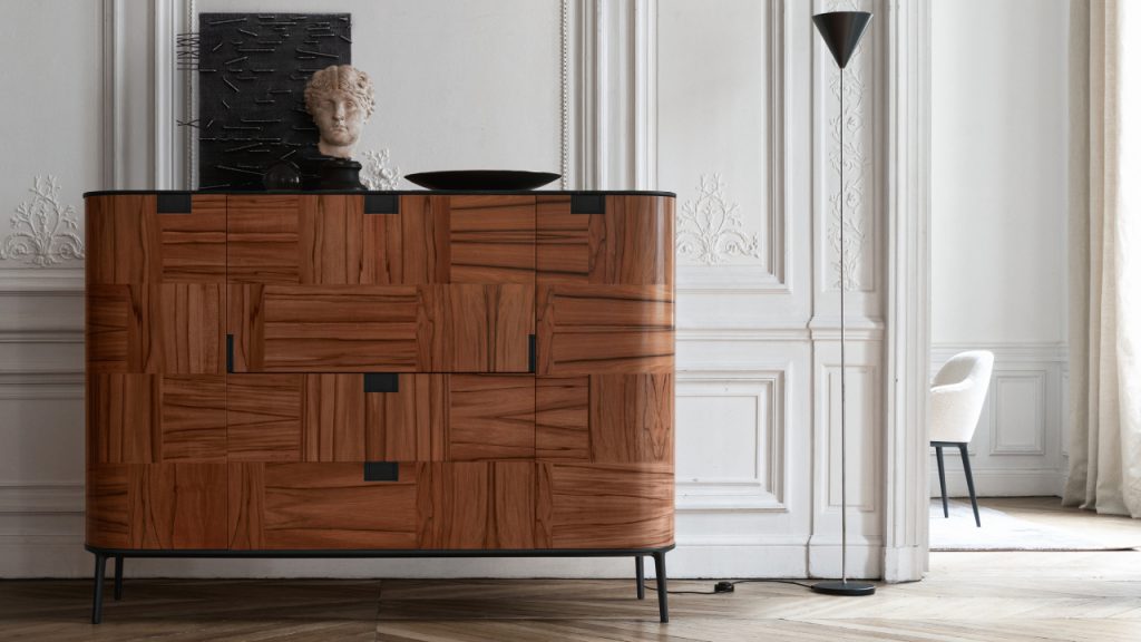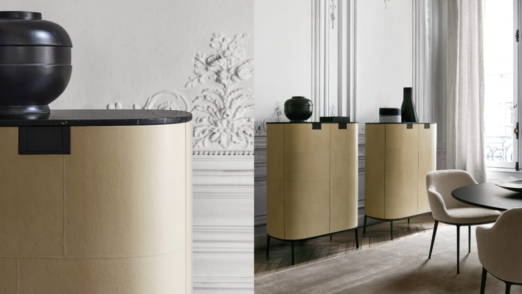 Citterio certainly remembered that one needs storage units which will also match the rest of the 2021 Maxalto collection. To this end, the Tesaurus harks back to serious craftsmanship with curved wooden doors – notoriously difficult to produce – that open to reveal shelves and refined maple frise interiors. With a choice of two or four doors, drawers and flap doors, the real decision is in the luxurious parchment or wood finishes which range from veneered oak or Chilean Tineo wood.