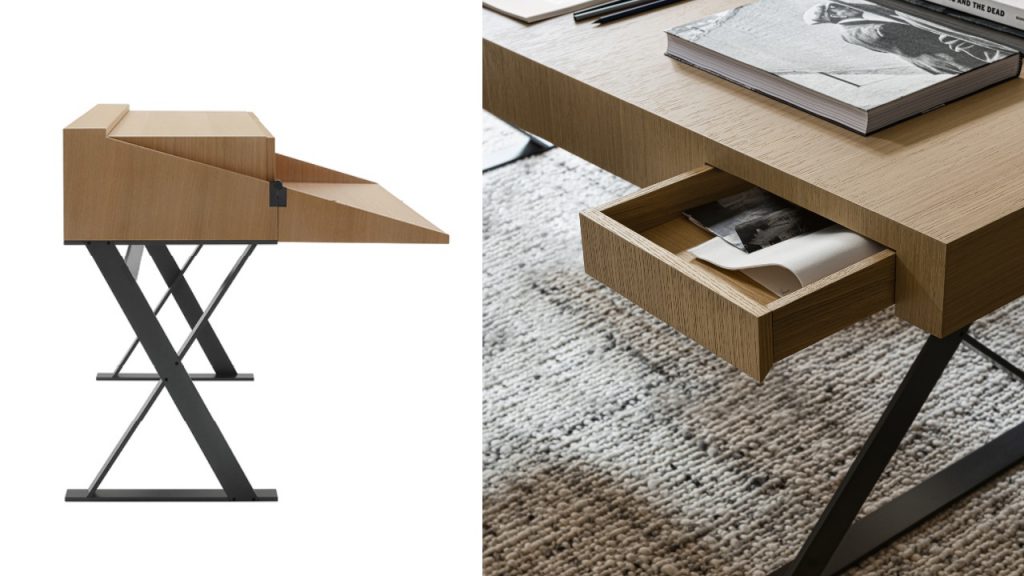 That neo-classical spirit which Citterio espouses can clearly be seen in this writing desk, which at once recalls a classic bureau embedded with a contemporary twist. Geometrically designed drawers on this flip-top desk are enriched by a variety of wood finishes; brushed light oak, brushed black oak and natural wenge, to add plenty of character to the study and home office.