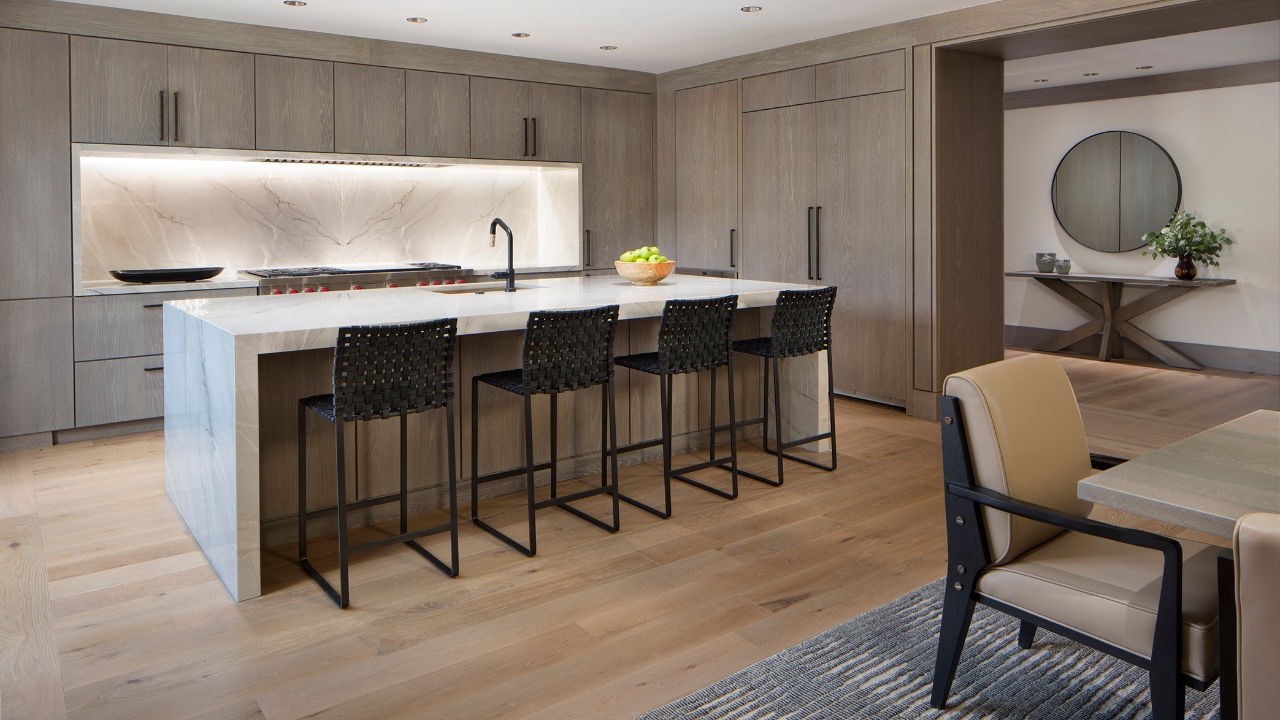 The Great Room, though spacious, is inviting and delivers an appealing warmth. Designed with plush furnishings and soft lighting to set the mood, it provides an embrace of comforting intimacy. A mix of cremes, wood tones and leather decorate the space, exuding timeless elegance while the double-sided fireplace offers a soothing sense of tranquillity and sentimentality. The large windows and gable vaulted ceiling allow for an abundance of natural light, offering a feeling of liberty within a haven of comfort. Light fixtures pay homage to its stunning locale, featuring a Christopher Boots statement chandelier that is made of natural quartz crystals to mimic the look of mountain icicles.
