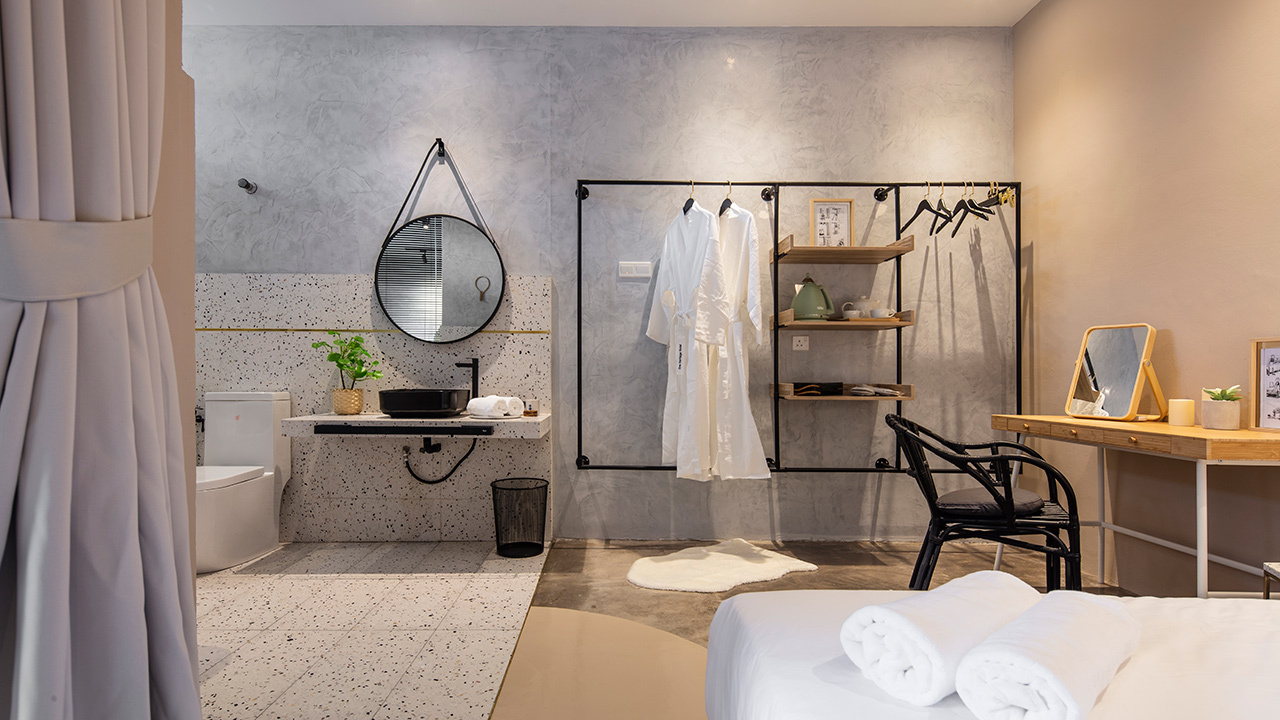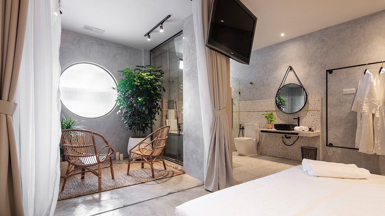 The deluxe king room showcases features a warm grey nuance – 12078 comfort grey – to encourage a clear mind, pairing it with pure white colours – 7236 chi, 9918 morning fog or 1624 skylight – to create a pleasing contrast.