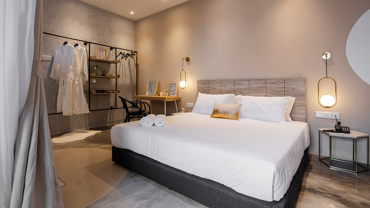 In the deluxe queen room pictured above, Jotun paints faint peach 10290 soft touch and golden pink 2024 senses is used to break the monotony of a beige wall.