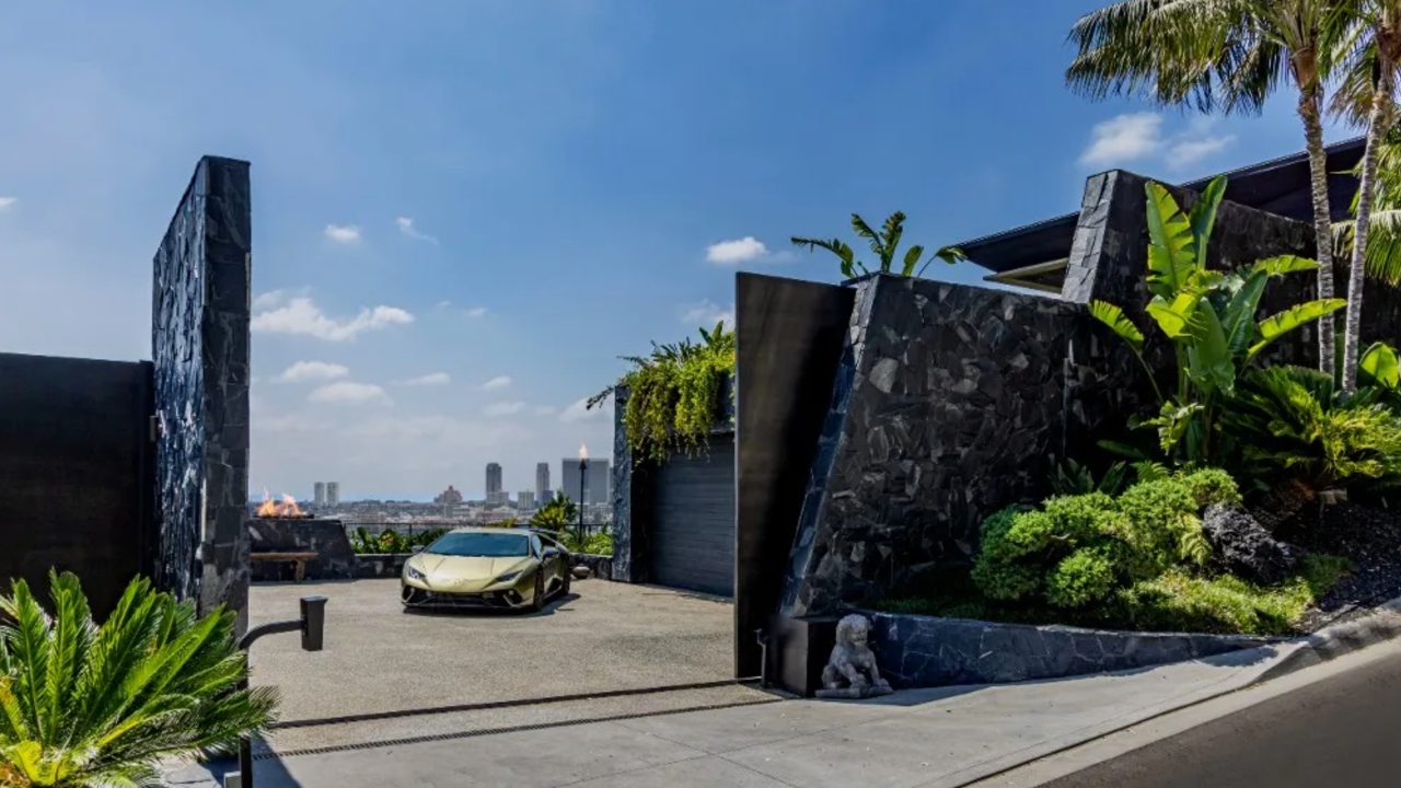 The property is set behind towering black stone walls and secured gated entrance. It’s fronted by a motor court and garage that together host a dozen cars. The exterior features an assemblage of Arabian black slate and traditional Japanese shou sugi ban raked wood, which took 18 months to install by hand.