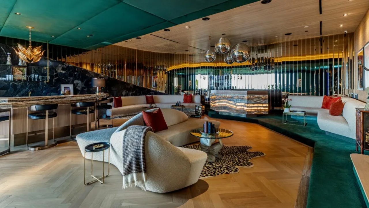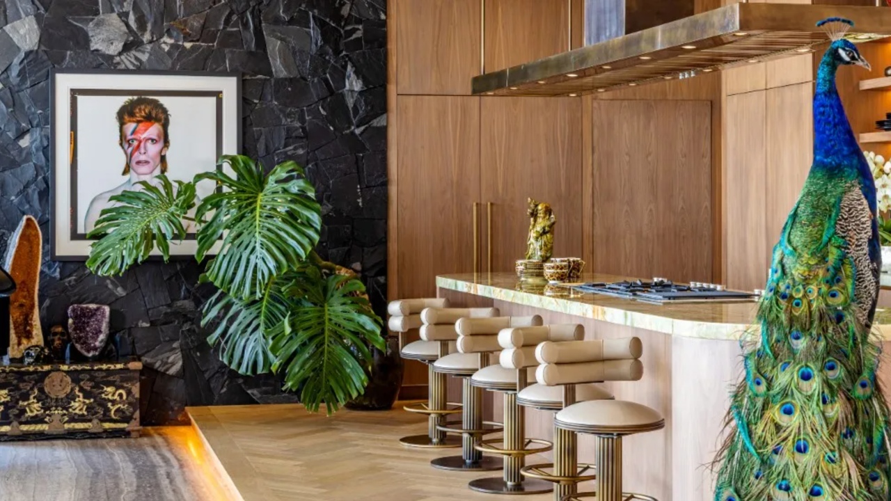 Inside, the home spans three stories and there are six en suite bedrooms and four powder rooms. It has a modern midcentury-inspired design with exceptionally eclectic decor and materials that wouldn’t look out of place in a funky five-star hotel. To bring this vision to life, they tapped Vantage Design Group and interior designer Victoria Gillet to help them achieve the dream home. The design can be categorized as old-school Hollywood decadence meets contemporary glamor. The best part? All you have to do is show up. The home comes stocked with all of the furniture, decor, and even toothbrushes and soaps in the bathroom.