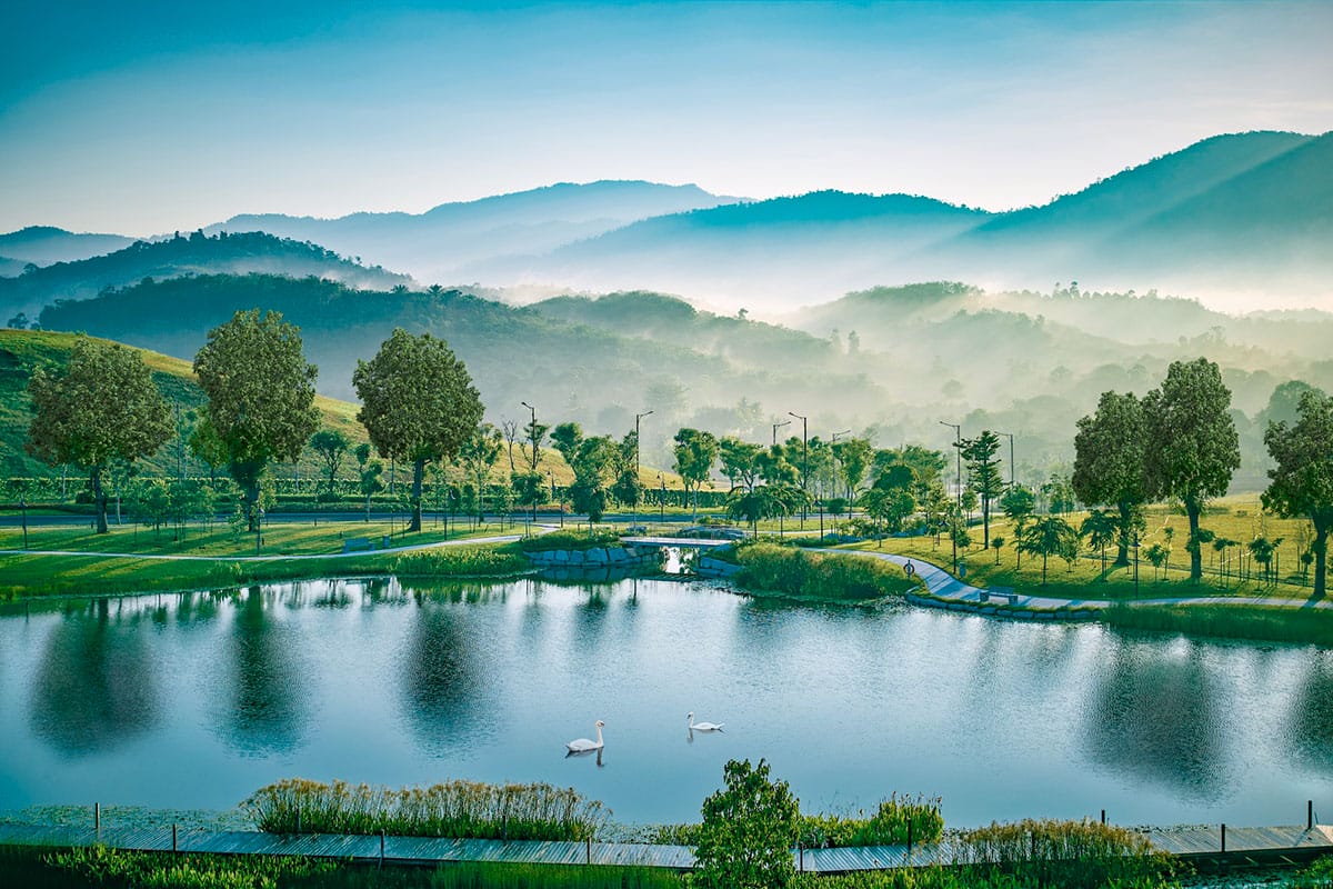 Beyond your manorial grounds, the stunning surroundings—comprising 10 serene lakes and lush parks—were carefully masterminded by Julien Hodson-Walker, landscape architect and founder of the multi-award-winning Walrus Design Sdn Bhd. Here, residents can spend the evening bird-watching and hoping for a glimpse of the endemic mountain peacock-pheasant, or take a leisurely stroll along the 8.2km private jogging track.