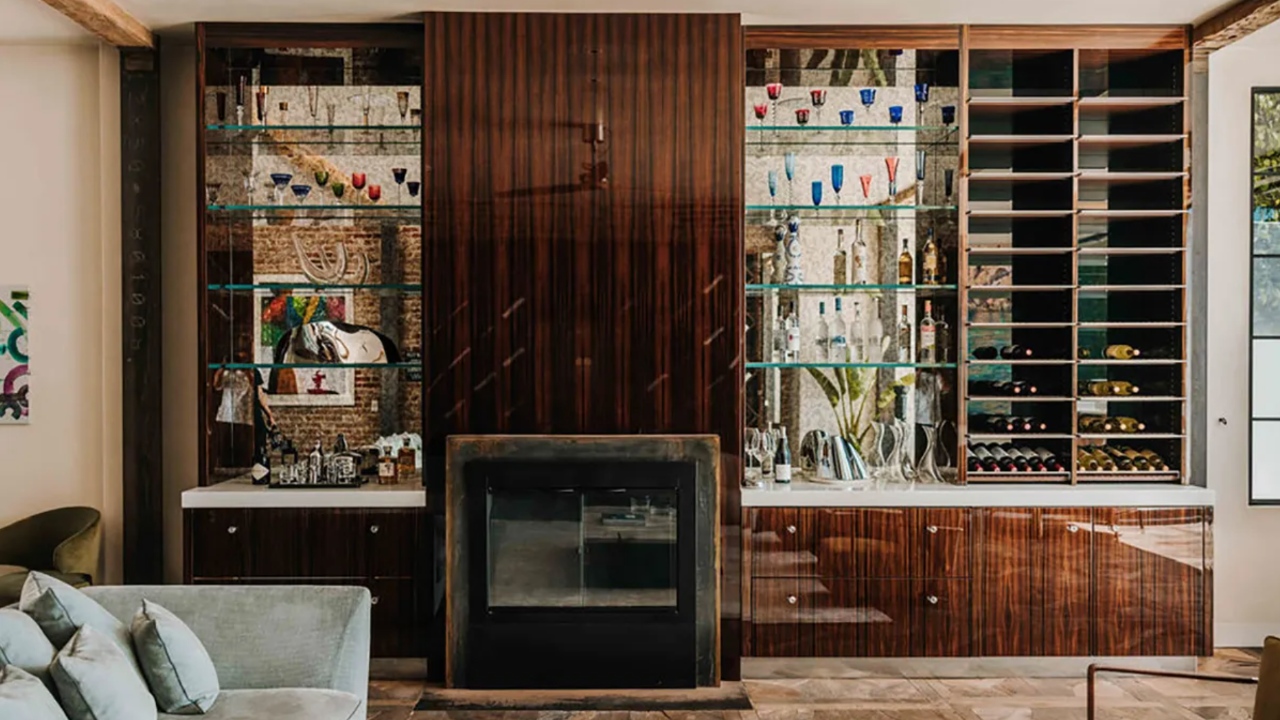 Among the other highlights is a bar-equipped living room that rests beneath a high wood-beam ceiling and opens via retractable doors to a fireside deck ideal for al fresco entertaining. An adjacent dining area connects to a gourmet kitchen outfitted with a center island, top-tier Wolf appliances, and an accompanying breakfast nook. A duo of primary suites includes one with a wood-burning fireplace and a bath spotlighted by a copper soaking tub and another that has a rooftop terrace with a hot tub.