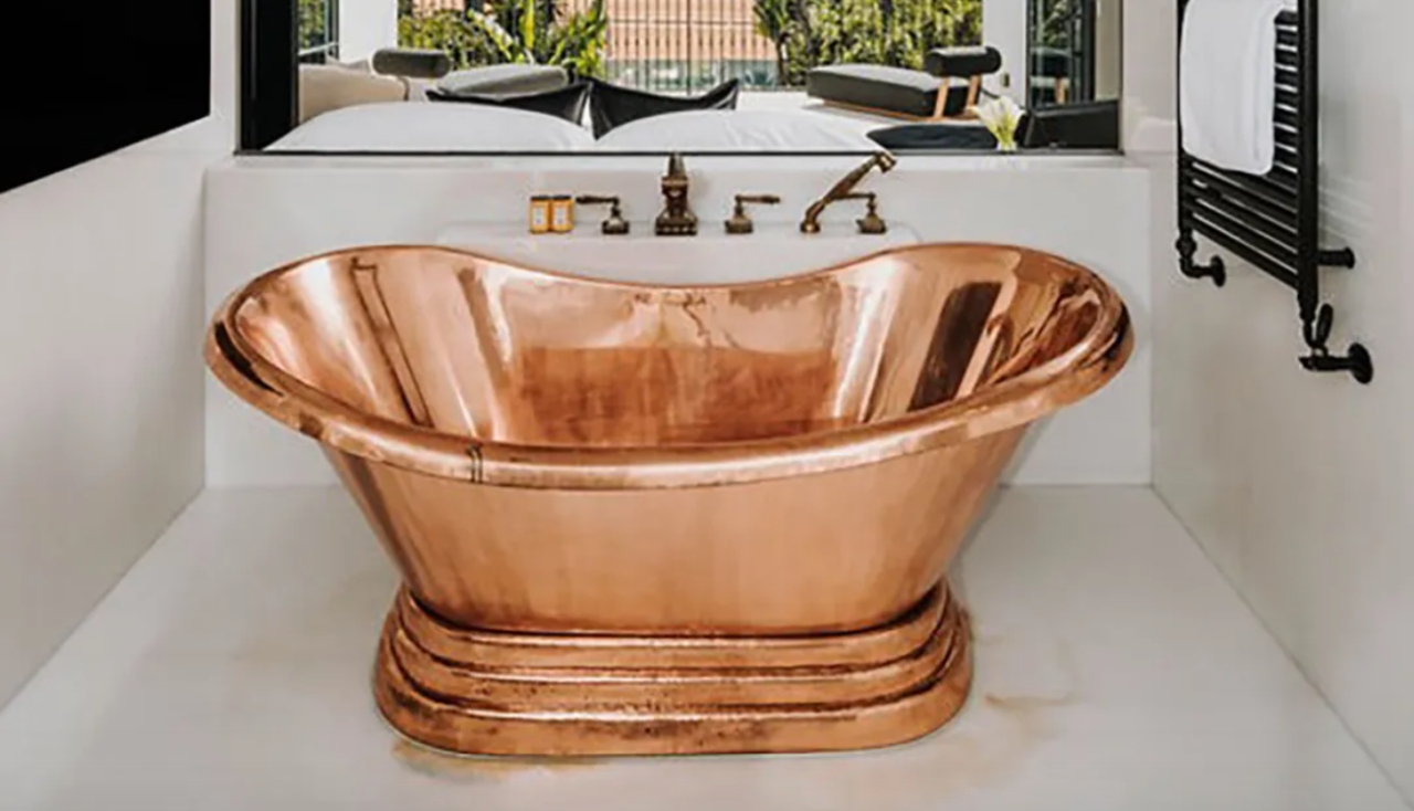 Described in marketing materials as “second to none,” the three-story residence is sited on the exclusive Palisades Beach Road, which is often referred to as the “original Billionaire’s Beach.” Protected by a high-tech security system, the property features five bedrooms and eight baths in a little more than 6,600 square feet of fully furnished living space boasting antique parquet and chevron-patterned oak floors, exposed brick walls, semi-precious stone accents, custom light fixtures, and walls of glass overlooking the Pacific.