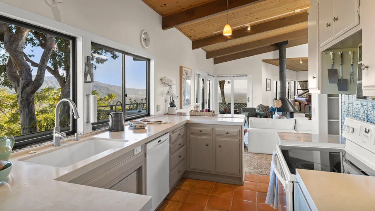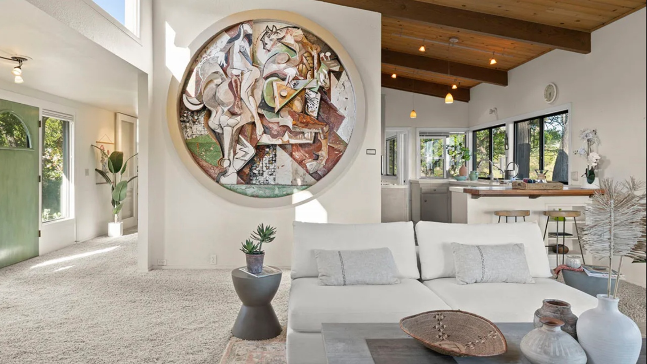Custom-built for Armitage and his then-partner Jill Penkhus in the early 1970s—and subsequently inherited by Penkhus, an artist who died in 2016—the green wood-sided structure is now owned by her husband, songwriter Jerry Millstein, and offers two bedrooms and three bathrooms in roughly 2,000 square feet of split-level living space boasting abundant windows throughout. A striking sculpture crafted by Armitage himself also comes with the sale.