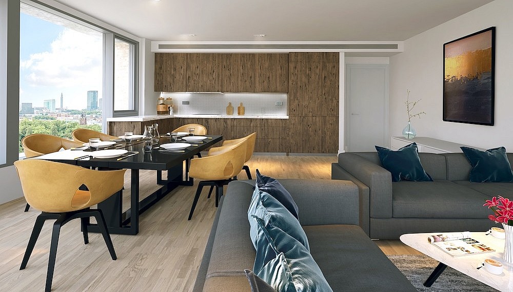 The Music Box is a great example of this, a striking collection of 41 apartments. The lower floors of the building are state-of-the-art home to London Centre of Creative Media and London Centre of Contemporary Music, with the residential ‘box’ cantilevered dramatically above. Surrounded by neighbourhood pubs, Southwark rail station and a vibrant community, The Music Box also lies just a 4-minute walk away from the Tate Modern and the Thames. Designed by architect Trevor Morris of SPPARC, the vertical white enamel panels between glass windows not only create the illusion of towering height from the outside, but also frame beautiful views of the London. There’s also an additional symbiotic connection; the interspaced enamel-glass design on the exterior is meant to evoke piano keys, while glazed bricks on the entrance facade are arranged match the Cream song ‘White Room’. Inside the apartments themselves, the generous space is a perfect canvas for high-end living, while the oh-so-slight distance from the Thames makes its prices oh-so-slightly-friendlier.