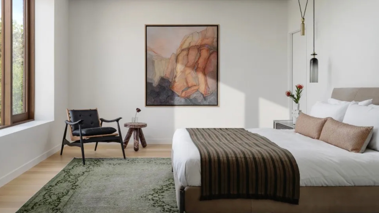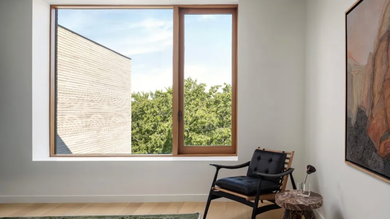 “A cornerstone of our design approach for the Greenbelt Residence is a dedication to humility, avoiding excessive opulence in materials and detailing,” Colombo says. “Notably, terrazzo floors and faceted wood trim are material highlights, contributing to an earthy sensibility that aligns with the connection to nature. We prioritized a modest and simple size and scale of the home while using glass expanses to create a sense of grandeur while minimizing wasted space. Thoughtfulness is another principle used in our approach, encompassing considerations like daylighting, site placement, and the use of locally sourced materials for sustainability. The utmost mindfulness was directed toward the heritage tree, view management, shade and shadow, and daylighting.”