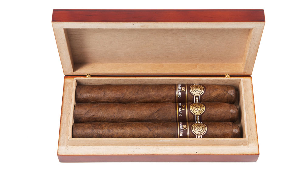 Altadis’ 80th Anniversary Montecristo, a 6 × 54 square-press belicoso, features a rich Ecuadoran Sumatra wrapper, a Dominican Olor binder, and Pilotico filler that was grown in the Dominican Republic from seeds smuggled out of Cuba after the revolution. The cigar delivers subtle spice notes, hints of oak, and aromas of sweet hay and leather. It is available in black lacquered boxes of 12 for $264 (RM1,140). Altadis has also produced 80 examples of an 80th Anniversary humidor that contains 80 cigars; the humidor is priced at $1,760 (RM7,600).