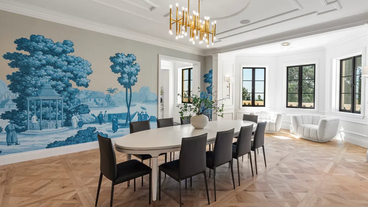 Completed this year, and known as the “Cockerham Estate,” the property features a total of nine bedrooms and 11 baths spread across stylish interiors accented with a mix of global and Old Hollywood elements—18th-century mantels from Europe, a custom lacquered wet bar inspired by The Langham, London hotel and hand-painted silk de Gournay-inspired mural, just for starters.