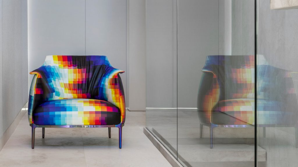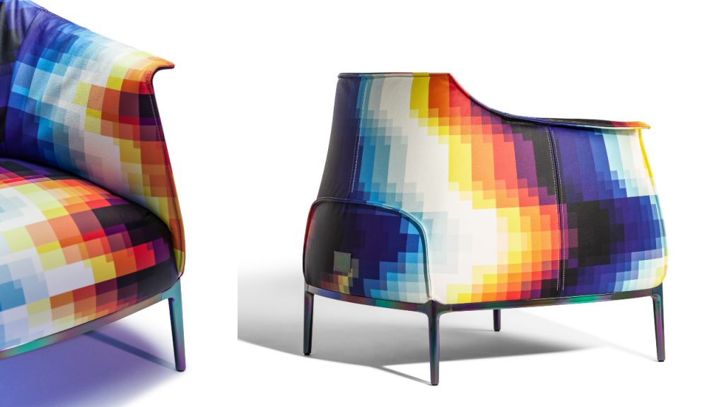 Utilising the leather-making techniques that Poltrona Frau has perfected for more than a century, Pantone applied his signature art style to the chair by printing the patterns directly onto the ‘Impact Less’ leather of the armchair. This eco-friendly leather is chrome-free and uses less and cleaner water, and reduces the necessity of chemical components in its production. Meanwhile, the base and metal legs of this anniversary-edition Archibald Armchair are finished with Multicolour Natural Chrome, completing the aurora borealis effect.