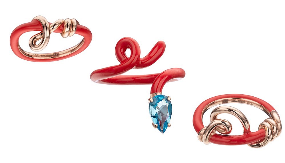 “I wanted to keep exploring enamel as a medium, but there are some limitations to its uses, so I chose to create these Vine Wrapped pieces that use gold vines instead of enameled ones,” Bongiasca explains. “In this manner, I did not have to limit my creativity to using enamel, and I could transmit the fluidity and curves of the collection to the metal part of the piece.”