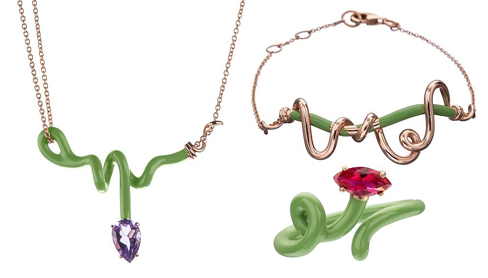 Millennial jewellery designer Bea Bongiasca has made a name for herself by crafting playful, kinetic pieces that experiment with florals, pop art and even rice. For her You’re So Vine collection, the Milanese designer created bold, sinuous enamel pieces that were inspired by climbing plants. The newest pieces in the collection include necklaces, rings, earrings, and a bracelet — all of which expand upon that unconventional, playful energy.