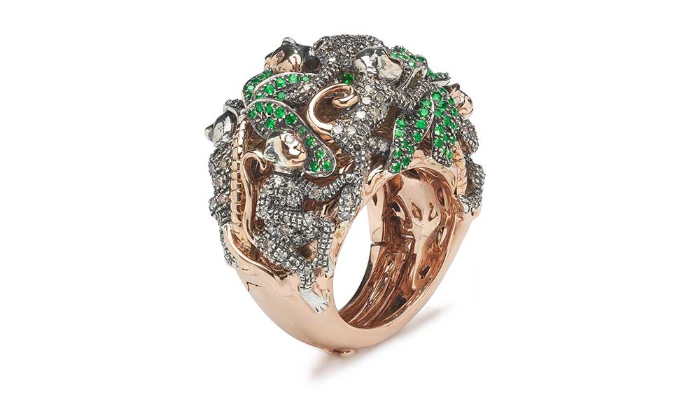 For Bibi van der Velden, jewellery clearly is much more than just precious metals and gemstones. During her frequent travels, the innovative sculptor and jeweller searches for the unlikely elements that define her imaginative pieces. Take, for instance, the collection that she recently created using the wing cases of scarab beetles. “The natural iridescence and colours of the wings could never be re-created outside of nature,” says van der Velden. She cast the delicate sheaths in gold or sterling silver and embellished the pieces – rings, necklaces, earrings – with a sprinkling of colourful gemstones.