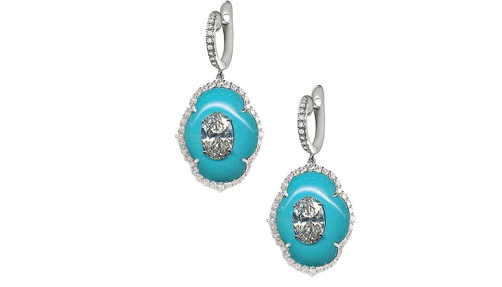 The Boghossian style blends an aesthetic inspired by patterns and motifs from India and the Middle East with statement-style European designs, as attested by a pair of turquoise earrings, which are inlaid with diamonds, and chalcedony cuff, with its inlay of sapphires and diamonds. Like the Kissing Diamonds method, the brand’s approach to inlaying is based on an old-world technique and allows for the creation of bold, modern styles with as little visible metal as possible. Says Boghossian, who continues to experiment with new methods, “We believe metal is an interference with the beauty of the stones.”