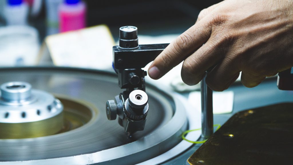 Using a polishing wheel that is weighted to eliminate any potential vibrations, the craftsmen work on individual facets to achieve the perfect proportions of a BrilliantC diamond. It takes about a year for these diamond polishers to train and become proficient in operating these diamond wheel cutting tools.