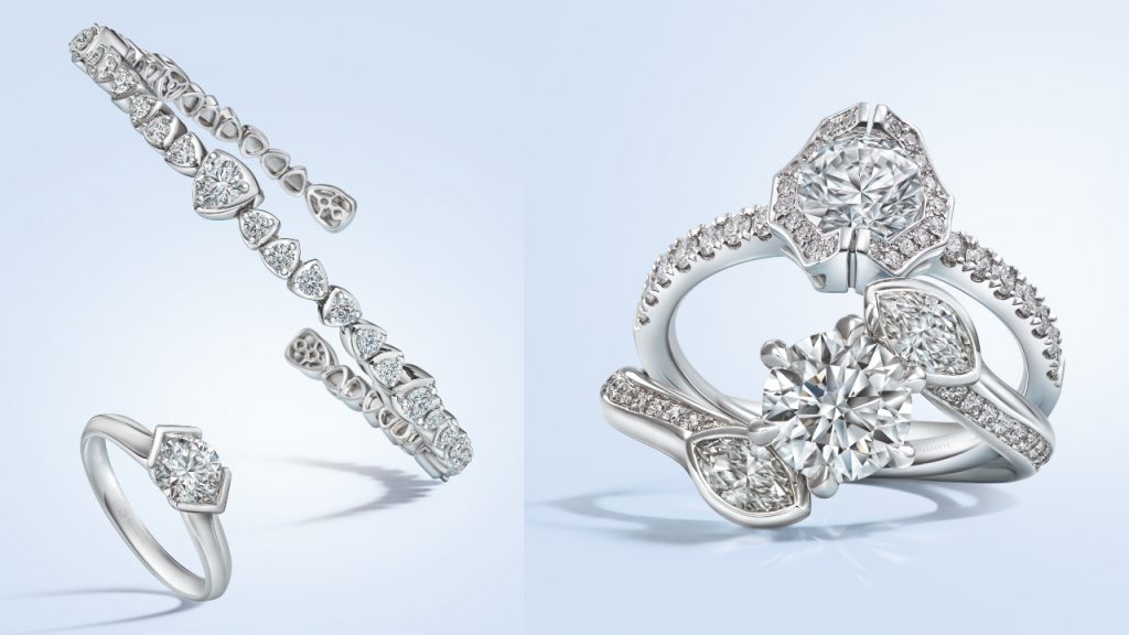 DeGem currently offers four distinct collections under its BrilliantC range: Ultimate with bold signature settings, Hurricane for trailblazers with its upward-swirling hurricane designs, Apex with its inclined architectural designs, and Legacy that pays tribute to human values and the circle of life. Shown below are pieces from the Ultimate (left) and Legacy collections.
