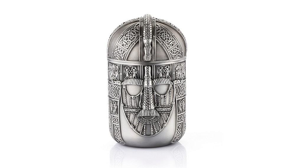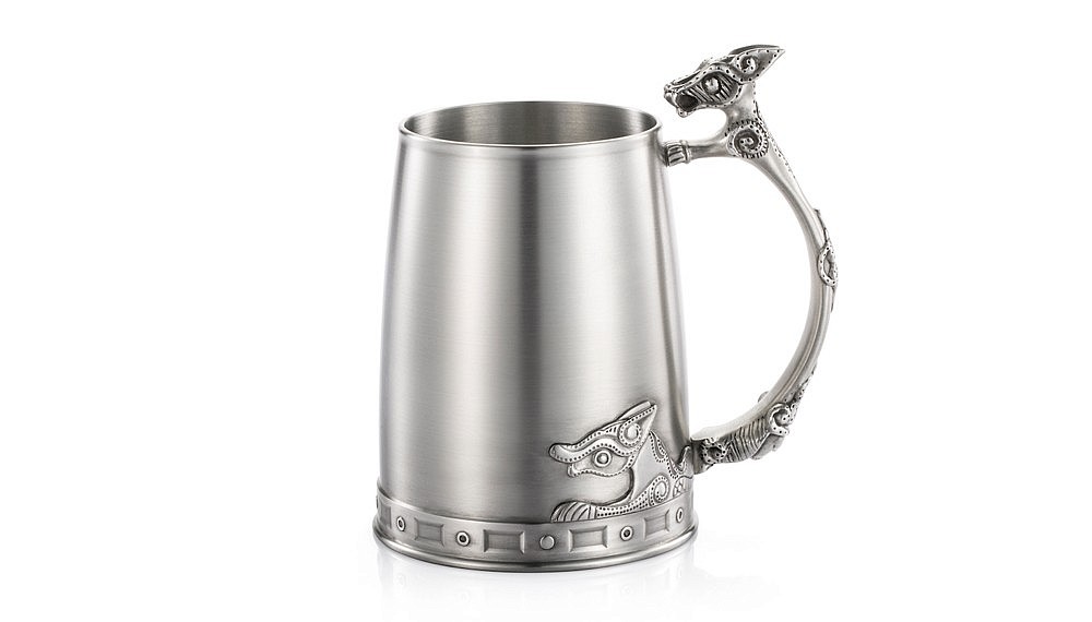 The most impressive piece is a tea caddy, that resembles a medieval helmet from a distance. The Sutton Hoo helmet, to be precise, from the Sutton Hoo hoard – a 6th or early 7th century cemetery excavation that is one of the most important archaeological discoveries of the English Middle Ages. Based on a detailed replica of the original helmet, the tea caddy captures details that seem impossibly intricate (but possible with pewter), from a soaring dragon to tiny dancing warriors. Another standout piece is the tankard, which references animal motifs on the Basse-Yutz Flagons from France.