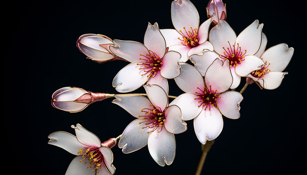 Each delicate petal unfurls gently with a slight flourish at the end, catching the light with its delicate upturned tip. This intricate replication of the cherry blossom is one of the wearable pieces of art created by Japanese artist Sakae.