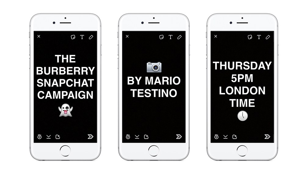 In September 2015, Burberry followers were given the first glimpses of the spring/summer 2016 womenswear collection on the popular image-messaging app Snapchat, a full day before the scheduled runway show. “With Snapchat, Evan Spiegel (co-founder and CEO of the app) has created a phenomenal platform that captures the spirit of a moment,” said Christopher Bailey, chief creative officer and CEO of Burberry. “The Burberry Snapchat show (allows) a unique, real-time view of the creation of our show which will include an unprecedented collection premiere hours before it hits the runway.”