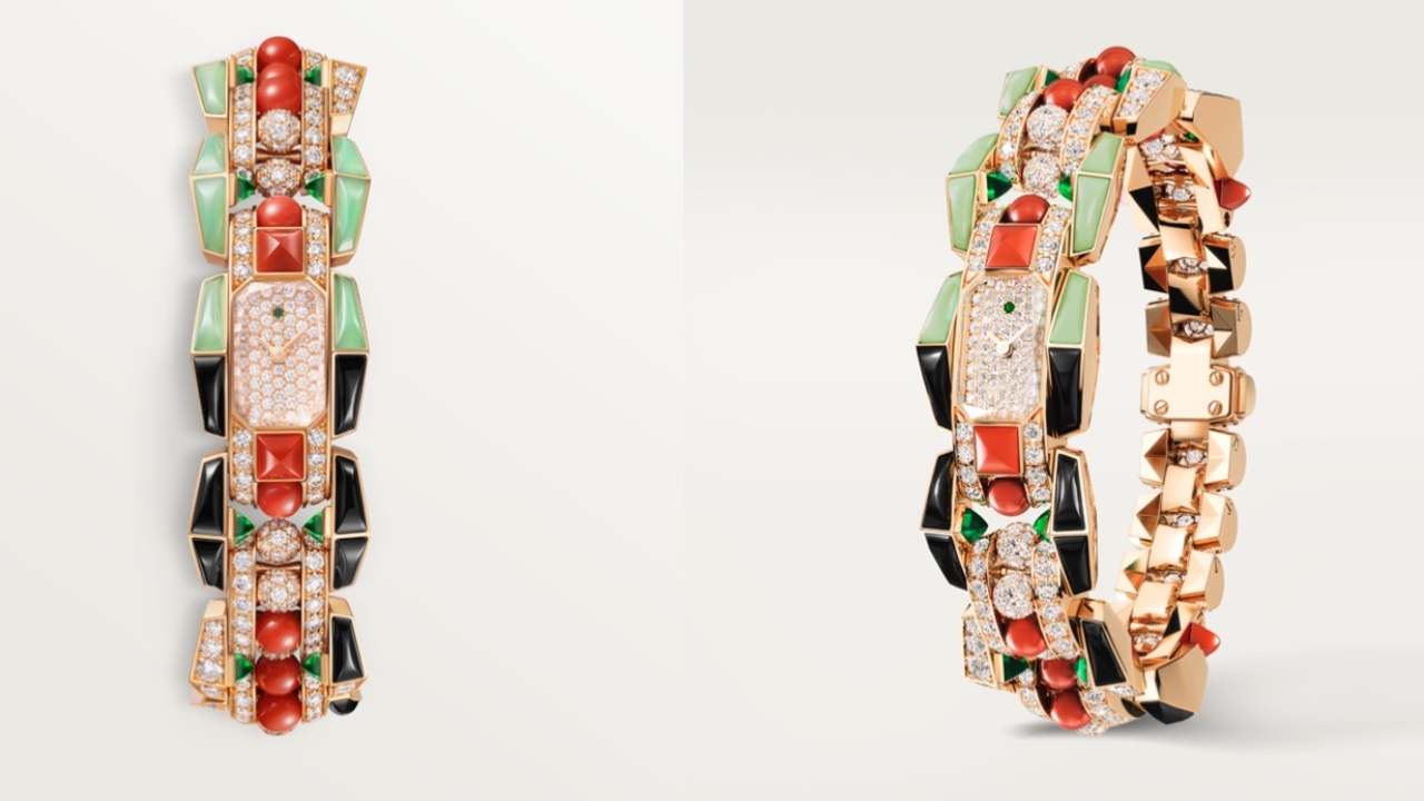 A clash of colours awakens the senses further in the collection’s most colourful model. Vivid coloured stones such as coral, chrysoprase and tsavorites—accented by black spinels set in purposefully irregular intervals for further unpredictability—form a unique Cartier timepiece. Each colour stands its ground, solid and distinct yet complementary when taken in as a whole.