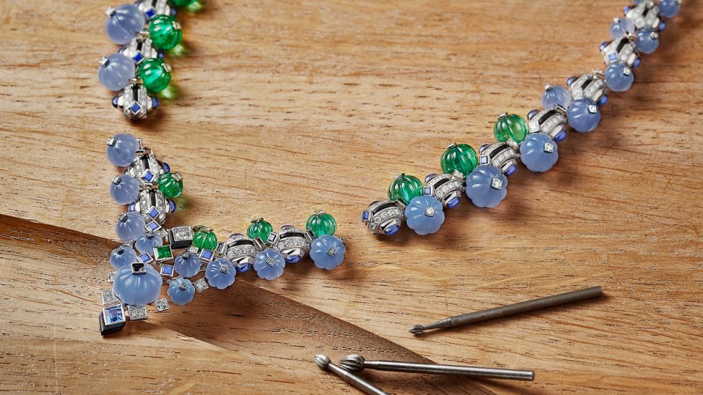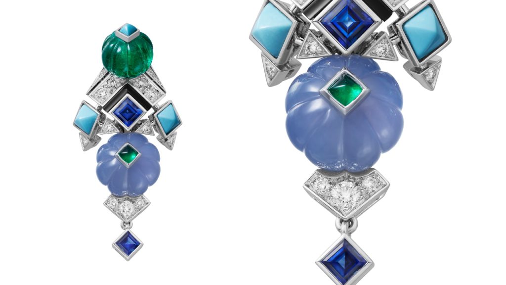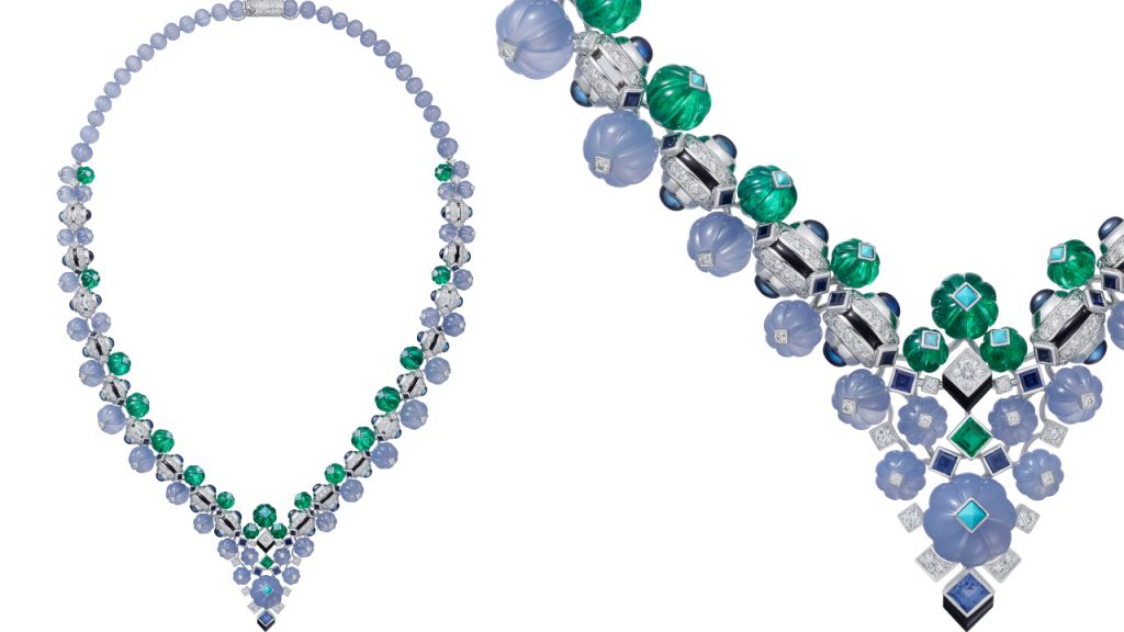 The set comprises a necklace, a ring, a pair of earrings and a bracelet, all of which are made up of tiny but luscious melon-cut emeralds and chalcedonies. Punctuated by turquoise squares and lined with shards of black onyx, the pieces also utilise a clever setting that alternates between sapphires and diamonds to create the illusion of movement. Like precious fruits sprouting from a jewellery tree, these pretty fluted balls transport us back to that fateful day when Jacques Cartier boarded the Le Polynésien bound for Bombay.
