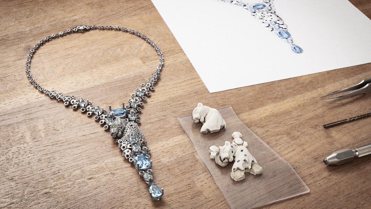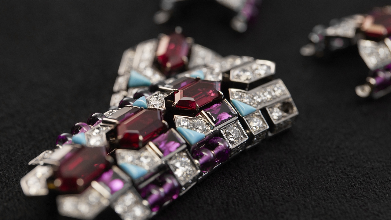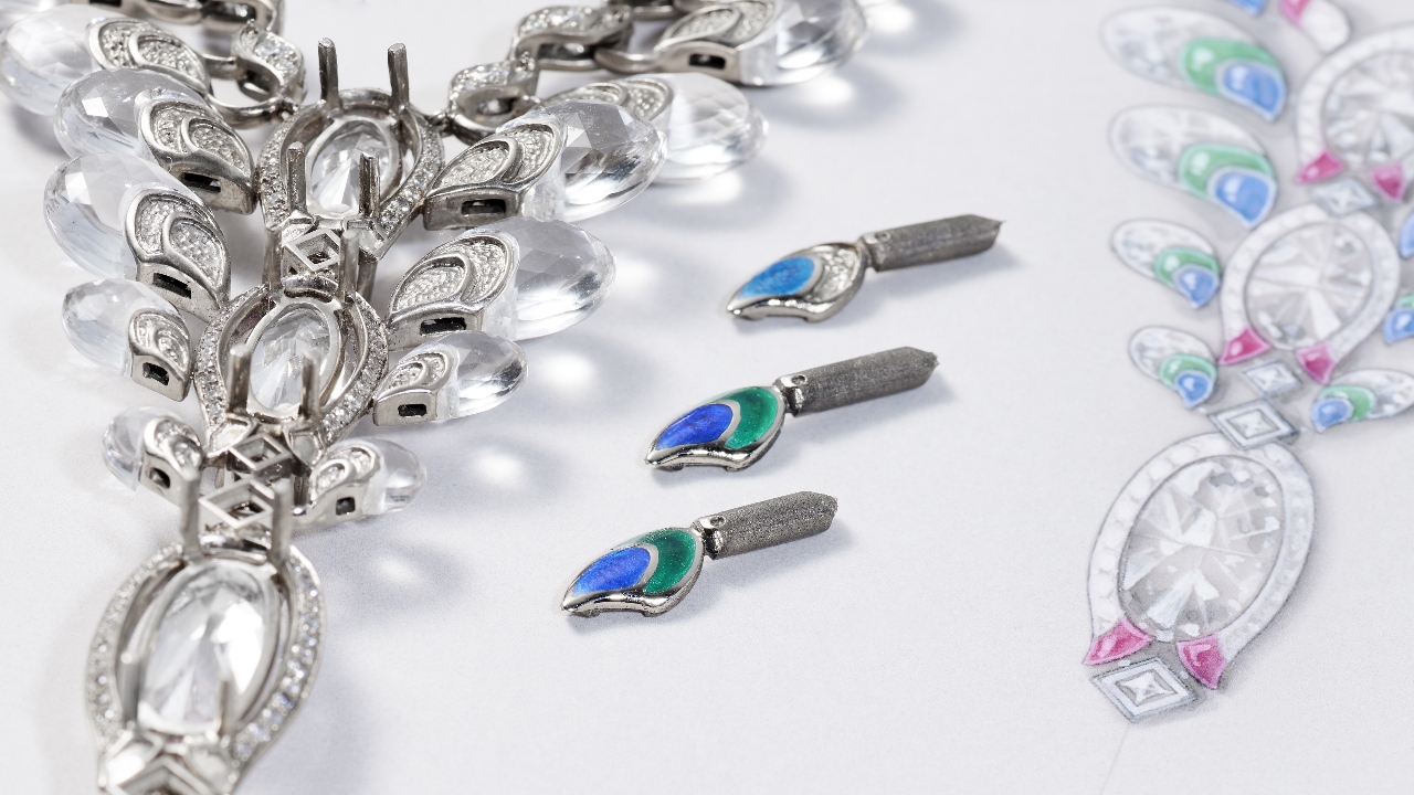 The Dohara necklace, which celebrates the richness of the empire, took more than a year to create, requiring the collaboration of six different professionals from the high jewellery workshops—who’ve succeeded in producing a truly unique piece that can be worn front or back. Both sides are equally breathtaking with three oval brilliant-cut diamonds taking centre stage. Red, green and blue lacquer elements showcase an emblematic Cartier colour combination on one side, and the fire of diamonds enhanced by rock crystal on the other.