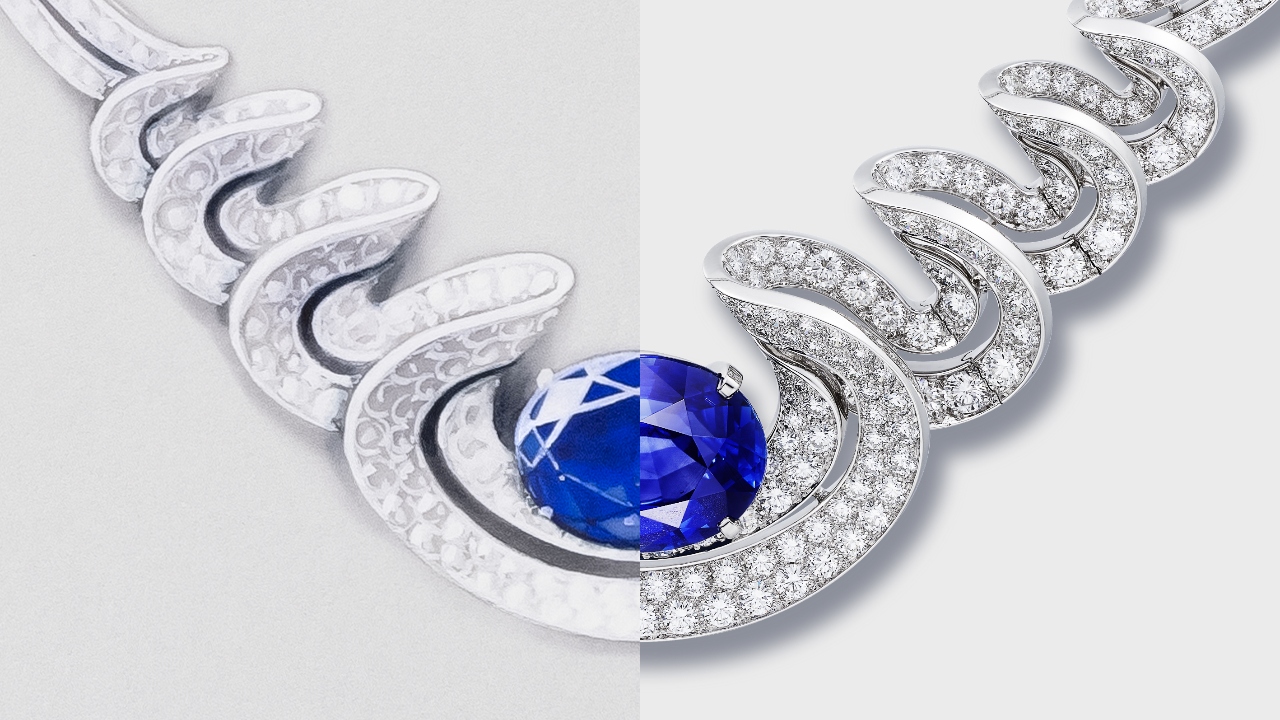 Making up the impressive ensemble is the Sama Necklace, which demonstrates Cartier’s ability to animate the inanimate. Embellished with a brilliant 19.27-carat Ceylon sapphire and framed by white gold and diamonds, a swirling series of curves and counter curves results in a striking sensation of motion.