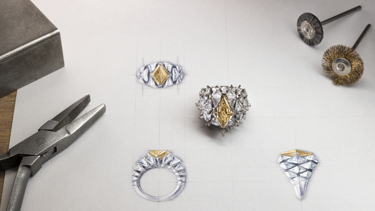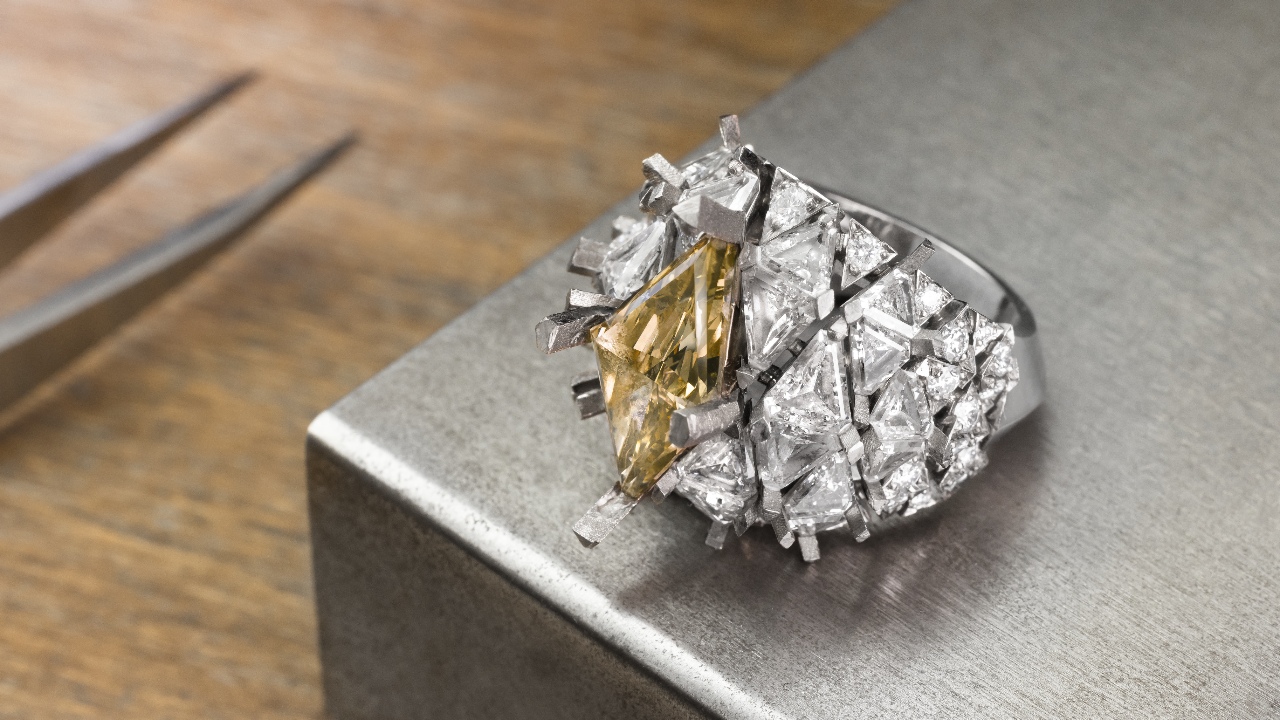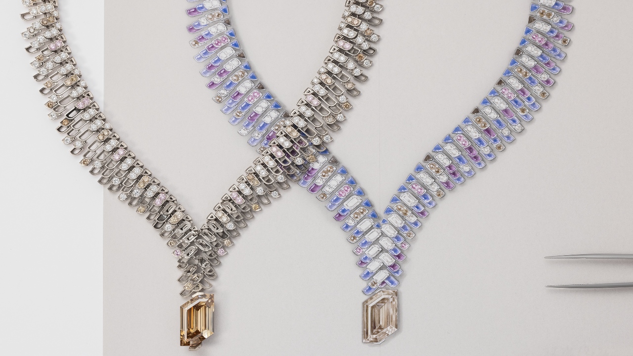 An exceptional suite of shield diamonds forms a complex structure of Claustra made up of broken lines with a dazzling 4.02-carat specimen at its core. The necklace gives an illusion of unity but is concurrently able to be worn as two separate pieces, making it a tour de force that exhibits the prodigious technical skill of the artisans.