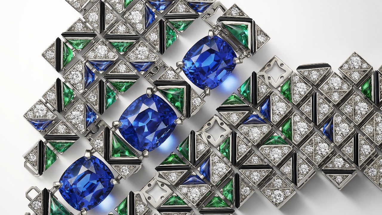 Like the Claustria necklace, the Miraggio Necklace draws inspiration from geometry and further combines it with optical effects and volume design. The necklace has its genesis in a line of Ceylon sapphires remarkable for their rare harmony of colour and shape. Together with emerald motifs, they form a symmetrical grid that is accentuated by lines of graphic onyx details to produce a kinetic appearance. The endeavour of two teams of experts culminated in an organisation of distinct planes resembling architecture, which feels like a second skin to the wearer.