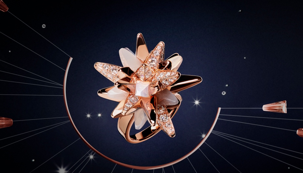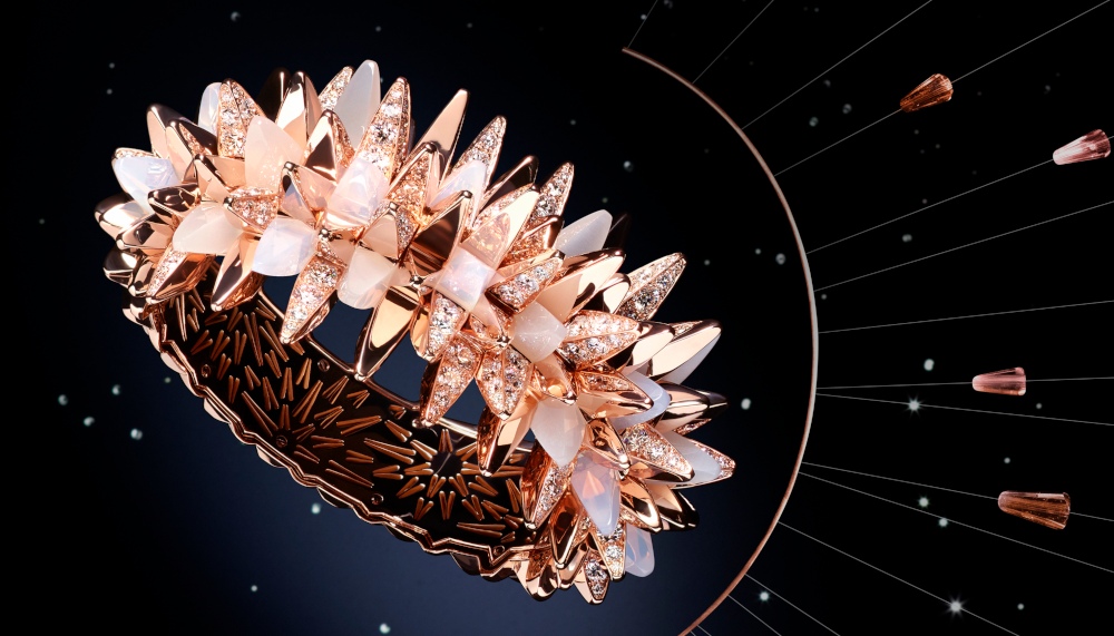 Each piece in the collection (which ranges between EUR12,000 – EUR205,000 or RM55,095 – RM941,216) builds on new materials and allows its wearer to experience unprecedented visual, tactile, and sound sensations. Tahitian pearls roll across skin, fiery opals and blue sapphires emit quivering light, and mobile diamonds shift in Cartier’s serti vibrant, or trembling setting. The star of the show – a bracelet featuring an irregular mesh of square cones formed from pink gold, diamonds, moonstone, and milky quartz – infinitely diffracts light, reminding us of our origins from meteorites, asteroids, and stardust crystallised over several million years.