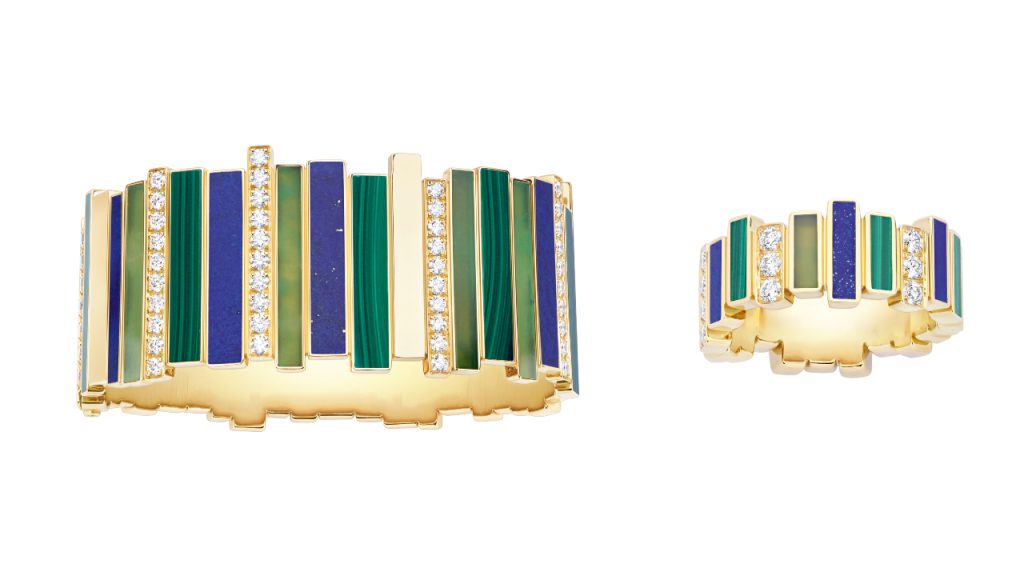 Several monochrome pieces in 18-karat white, yellow or rose gold with diamond links let the asymmetrical shape speak for itself. Others are adorned with wildly different gemstones and minerals that create a kaleidoscope of colours. There is also a cuff bracelet and a watch both fully set with diamonds, for a dose of pure glamour.