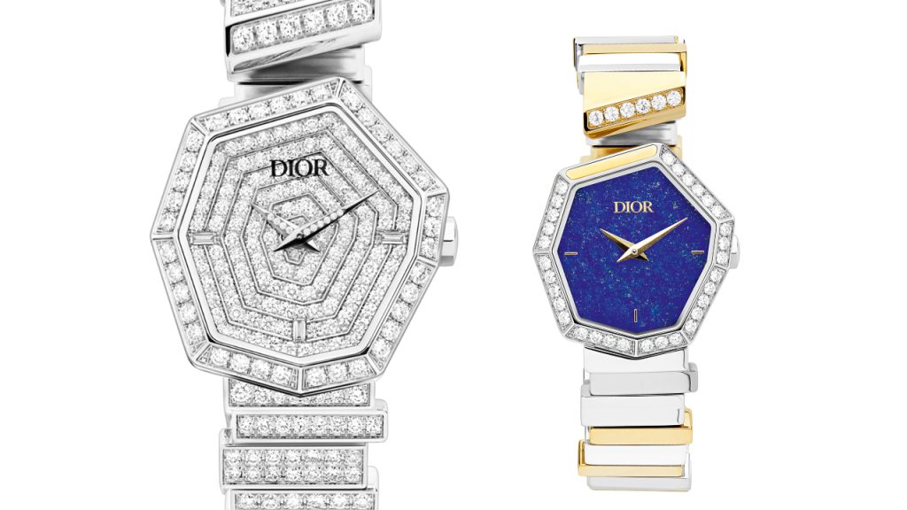 Dior has put a new spin on traditional watch cases by focusing on the organic, natural shape of gemstones—the irregular octagonal case shape is inspired by a slice of rough tourmaline. The bezel is set with diamonds, and some have gold or onyx inserts at the top of the case and the fully articulated bracelet is designed as an open cuff rather than a clasp. It wraps around the wrist ending with a diamond-set insert at the top of the case, which leaves a sliver of skin exposed. It could even be worn as a bracelet if you wore it with the dial positioned on the inside of the wrist. The watch bracelets have the same link design as the jewellery but include a steel model and a dual-tone bracelet that alternates 18-karat yellow gold with steel. Each also comes with a black alligator leather strap topped with a diamond insert at the end.