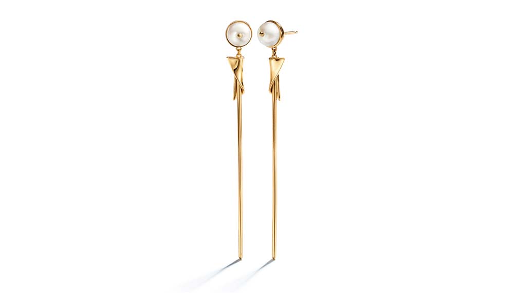 “I was attempting to achieve a mixture of both traditional and non-traditional metalsmithing techniques, where structured forms became draped in fluid metal,” says Borgo, who cites the collection’s flowing 18-karat-gold collar necklace with pearl pendant as the most difficult to complete. “The drape creates the illusion of soft flowing fabric, the pearl creates the illusion of weight. This achievement of balance was quite challenging to mould.”