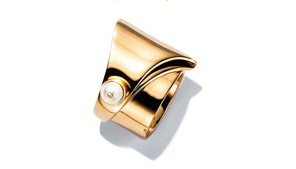 “I was attempting to achieve a mixture of both traditional and non-traditional metalsmithing techniques, where structured forms became draped in fluid metal,” says Borgo, who cites the collection’s flowing 18-karat-gold collar necklace with pearl pendant as the most difficult to complete. “The drape creates the illusion of soft flowing fabric, the pearl creates the illusion of weight. This achievement of balance was quite challenging to mould.”