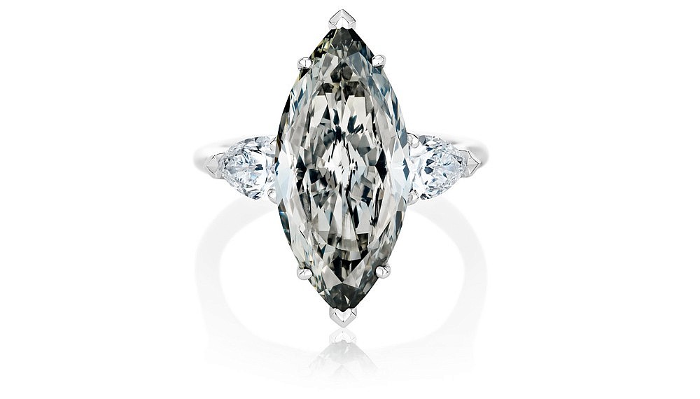 Subtle tinges of green and blue shine through this luminous 4-carat marquise-cut grey diamond by DeBeers. The striking solitaire is buttressed by two pear-cut white diamonds and set in sleek platinum.