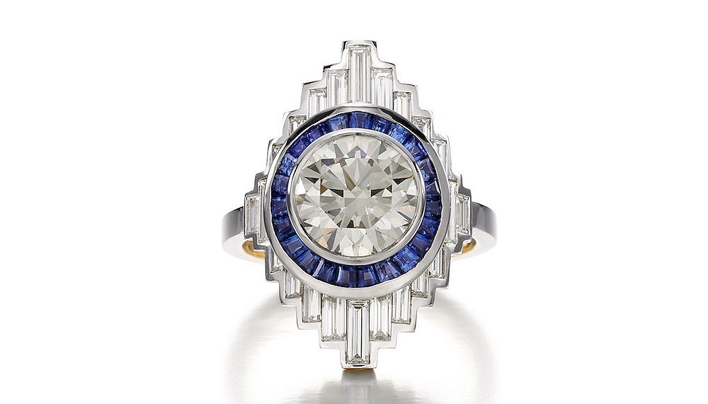 This 18-karat white-gold New York Ring, by London-based designer Jessica McCormack draws inspiration from Manhattan’s grid mapping system and centres on a 2.5-carat natural grey diamond that is surrounded by hand-cut blue sapphires and baguette-cut white diamonds. “When you gaze upon a yellow, pink or green diamond, even from a distance, you instantly appreciate the colour,” notes McCormack. “But with a grey diamond, it requires a more concentrated look. They have an understated elegance that draws you in but in a less obvious way.”