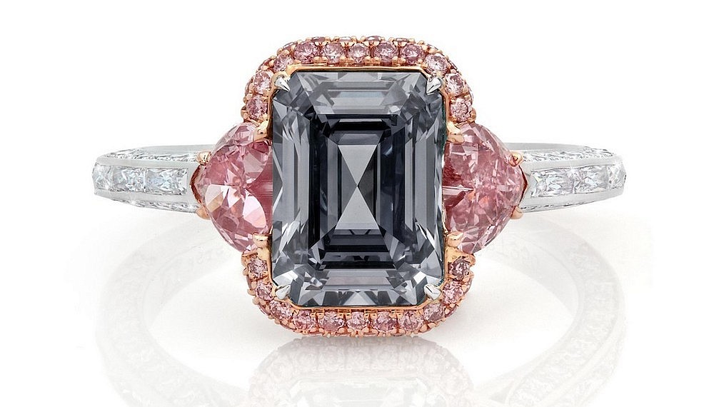An intensely smoky, 2-carat fancy grey diamond in this Martin Katz ring serves as a stark contrast to two bright pink heart-shaped diamonds and a surrounding pink diamond frame. This ring’s juxtaposition of pink and deep grey is decidedly modern, and totally entrancing.