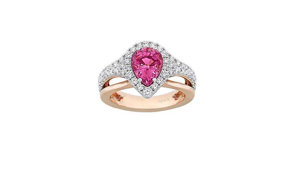 Mumbai’s Coomi Bhasin frequently works colourful pink spinel into her ornate designs. This handcrafted ring centres on a luminous 13-carat pink spinel that is framed with four petite yellow diamonds and set on a diamond band. Meanwhile, this 18-karat white-and-rose-gold ring from New York’s Spark Creations centres on a pear-shaped, pink-hued spinel framed with white diamonds.